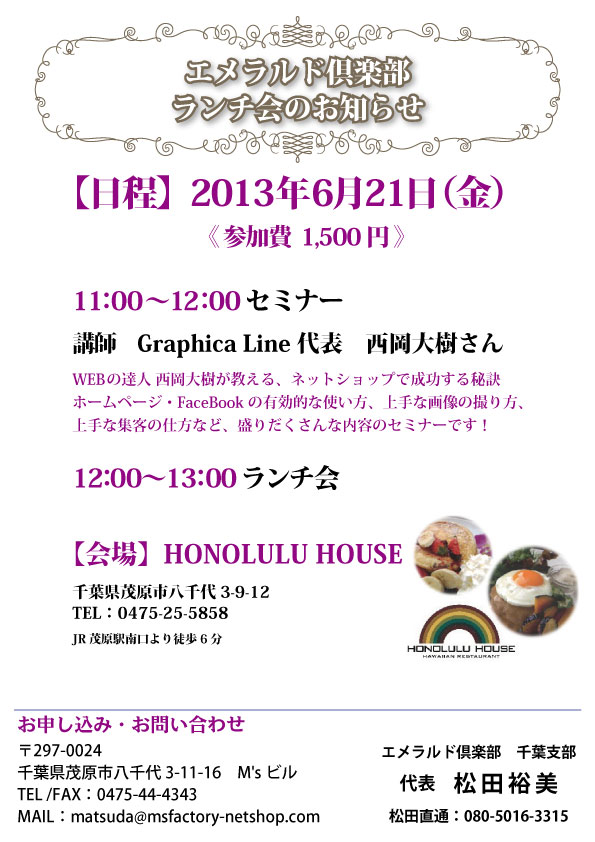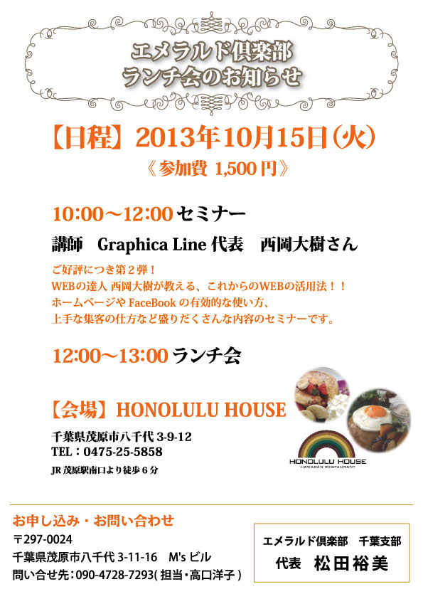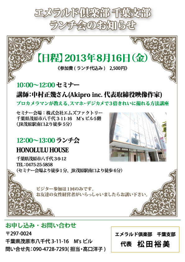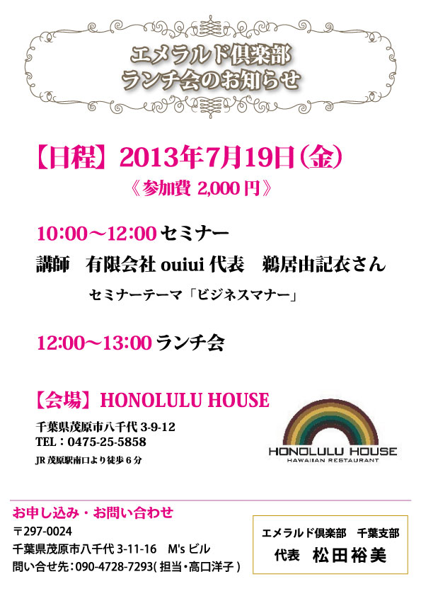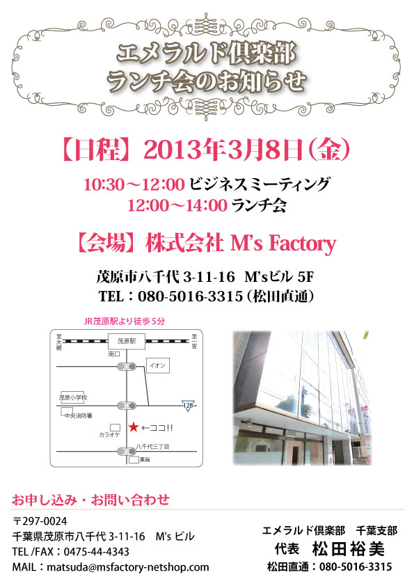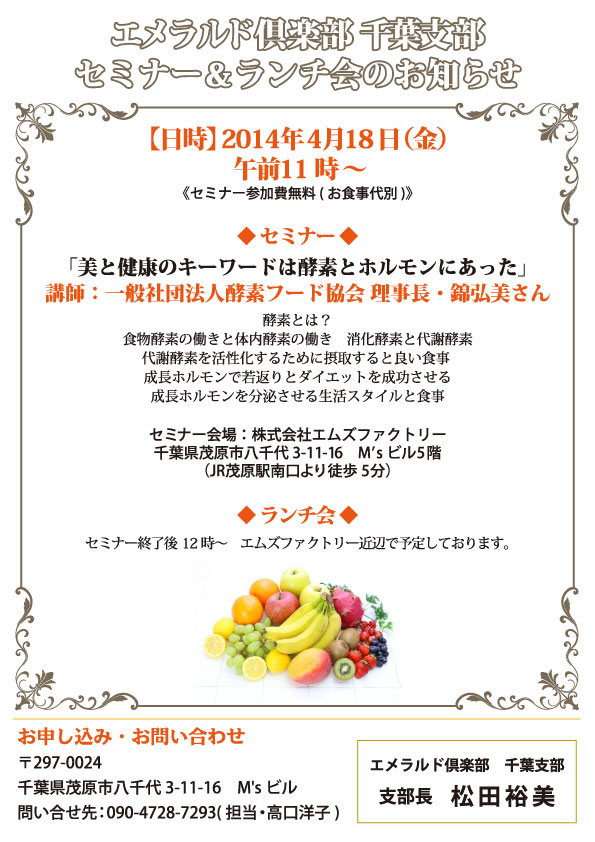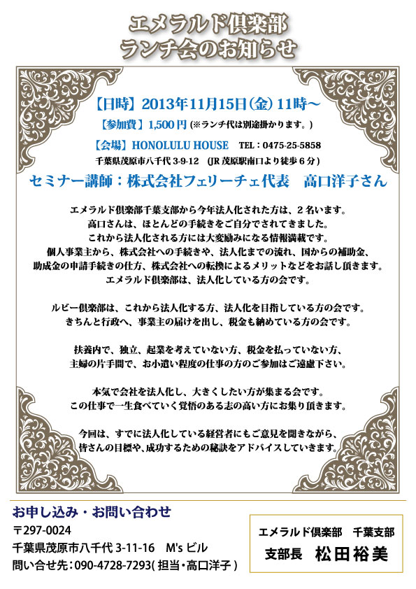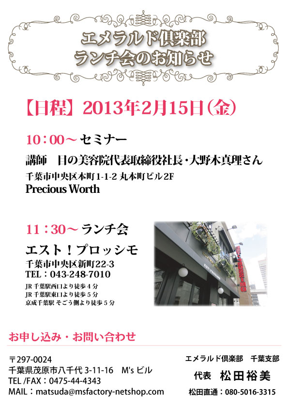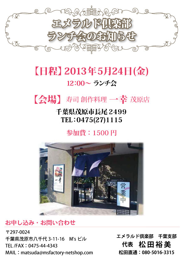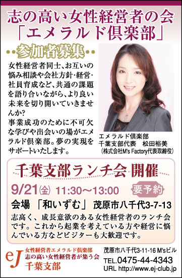 千葉支部のエメラルドランチ会を開催します。ビジター参加も大歓迎です!
