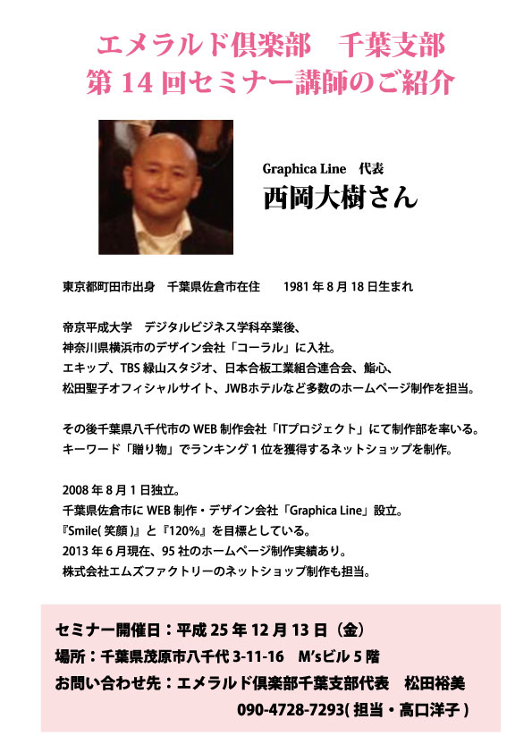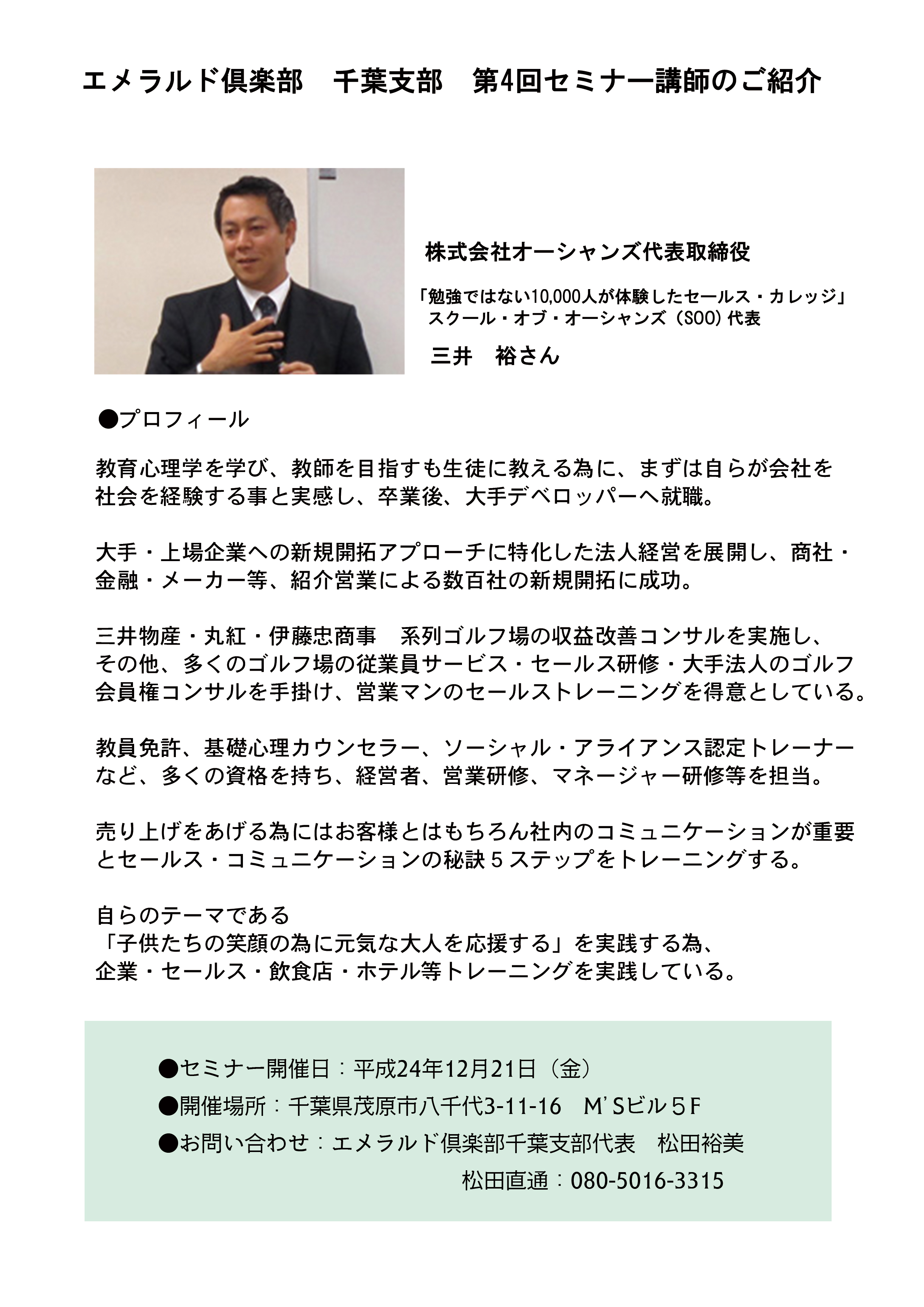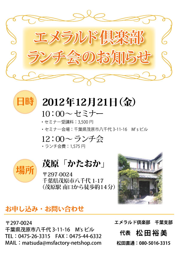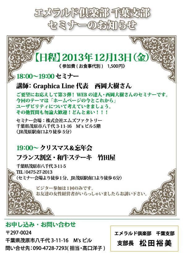 千葉支部のエメラルドセミナーとクリスマス&忘年会を開催します。ビジター参加も大歓迎です!
