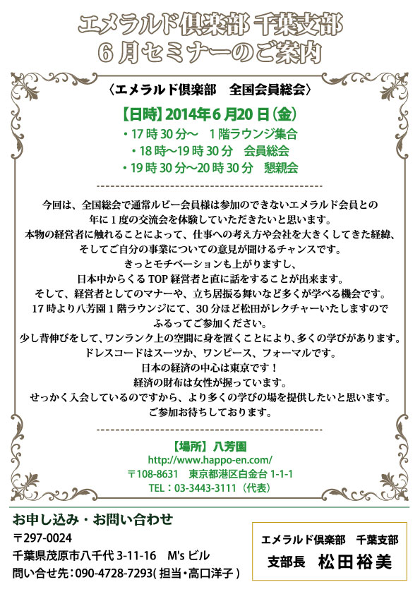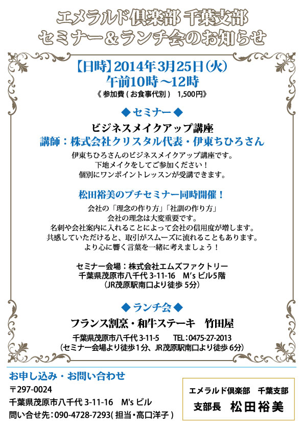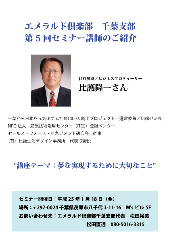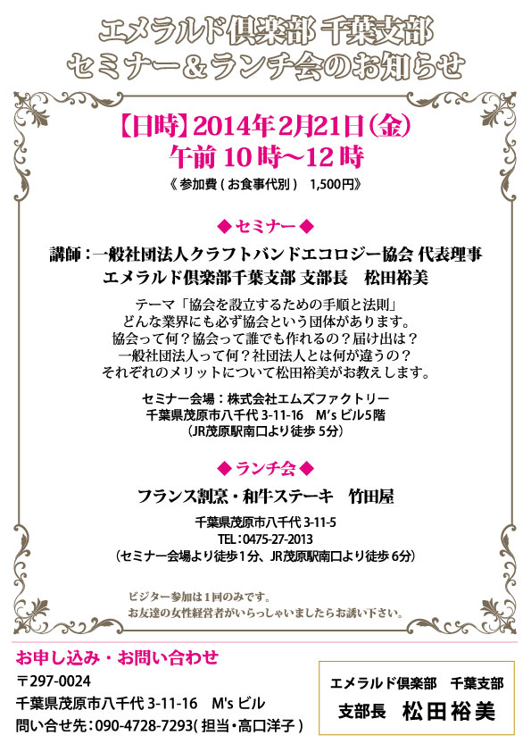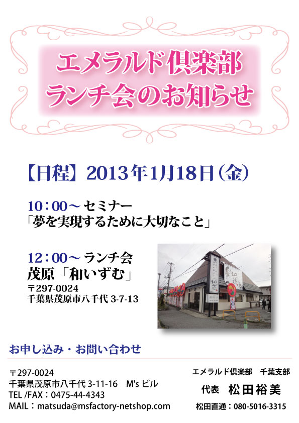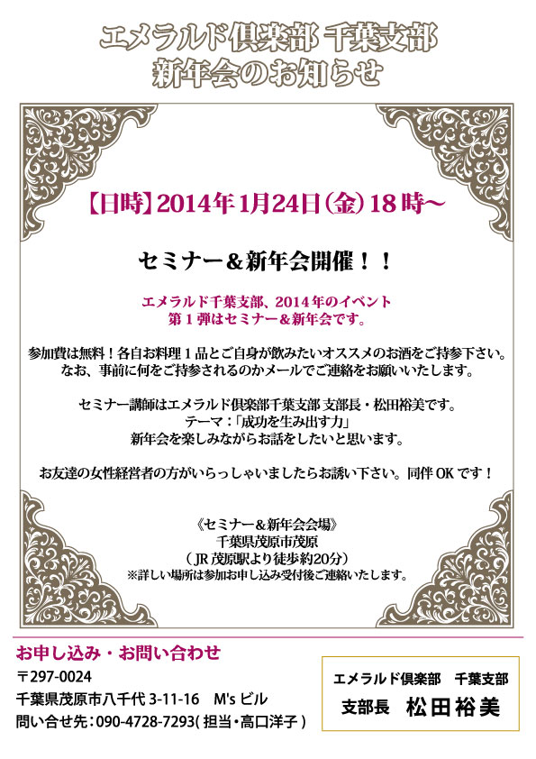 千葉支部のエメラルドセミナーと新年会を開催します。ビジター参加も大歓迎です!