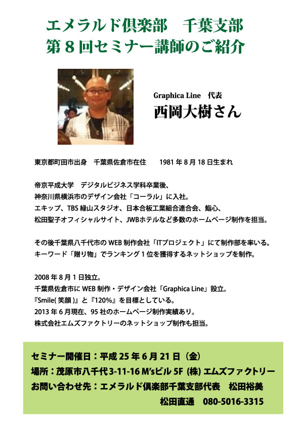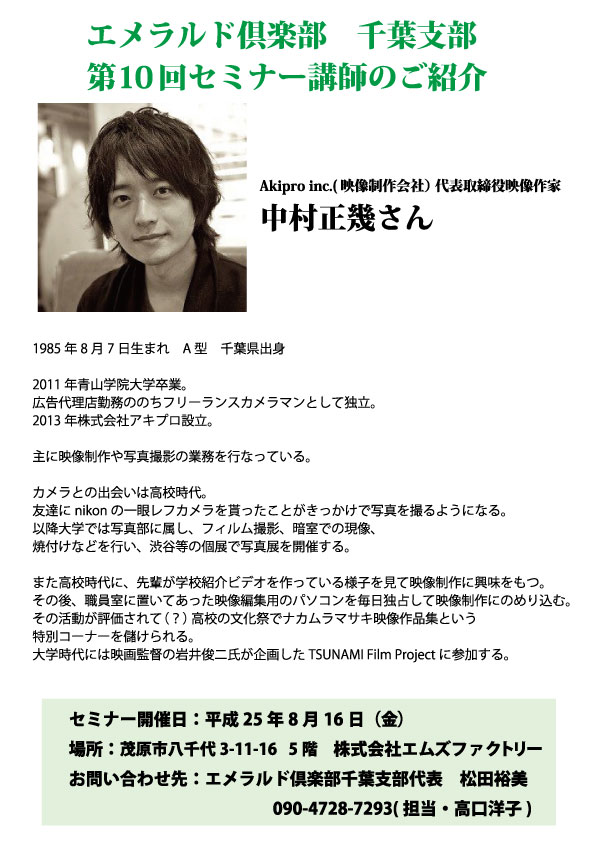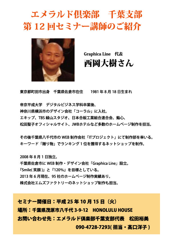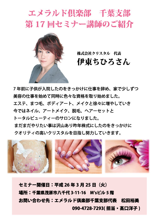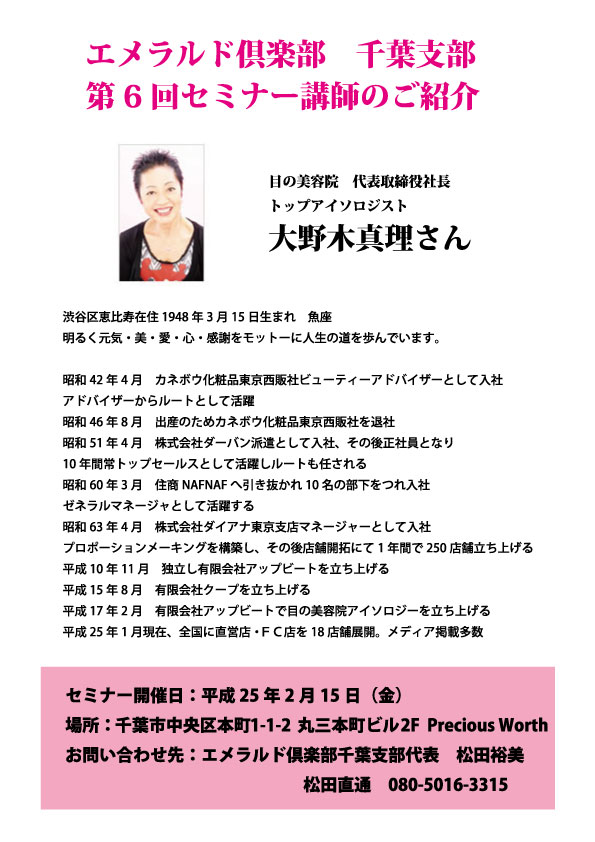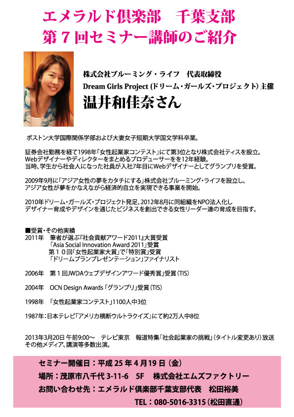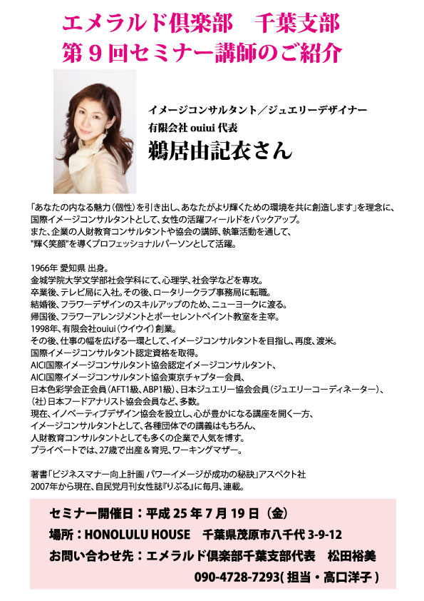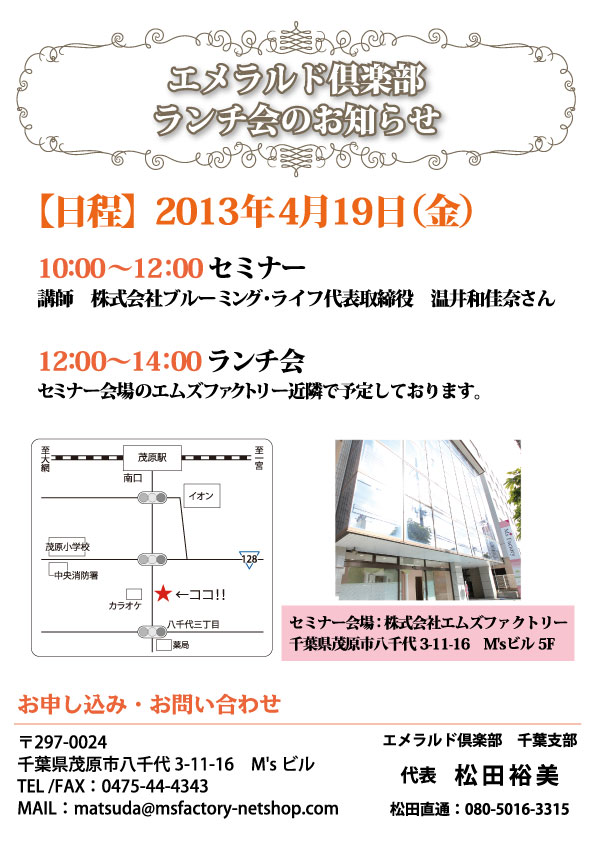 【千葉支部】エメラルドランチ会←クリック!! セミナー講師:星野有香さん ※ホシ☆ユカさんプロフィール 千葉支部のエメラルドランチ会を開催します。ビジター参加も大歓迎です!