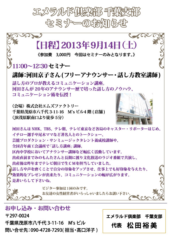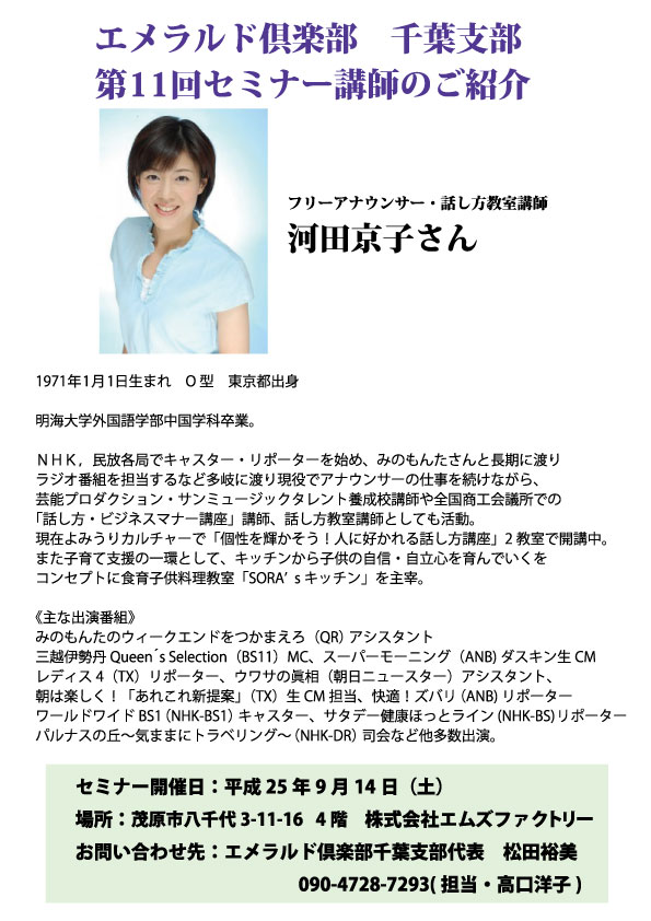 千葉支部のエメラルドセミナーを開催します。 今回はセミナーのみになります。 河田さんが20年のアナウンサー歴で培った 話し方のノウハウ、コミュニケーション術を伝授! ビジター参加も大歓迎です!!